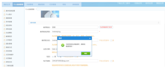 导师主页作为研究生导师对外宣传的重要窗口,促进研究生招生工作的同时,也可全面提升学校的社会影响力。导师主页内容中如若夹杂了反动、色情、暴恐违禁等信息,会给学校和导师带来极大的法律风险以及造成不良的社会影响。