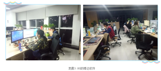 为了这一刻,值班服务团队成员放弃休息,昼夜不息,用拼搏的心态和全力奋斗的决心,将博达软件专业、及时、高效的服务态度传递给客户。