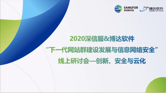 2020年4月2日,博达软件携手深信服联合举办下一代网站群建设发展与信息网络安全线上研讨会。成功汇聚2500余家全国大中型企事业单位,覆盖高校、政企、健康等多个行业,共同见证和探讨下一代网站群建设发展命题及信息网络安全发展趋势,现场气氛活跃,获得参会嘉宾一致赞赏和好评。