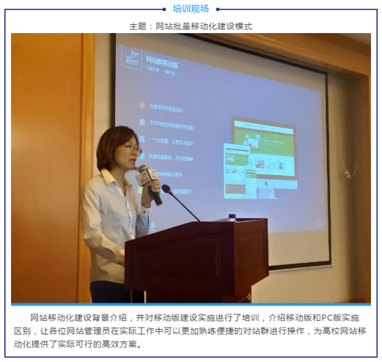 此次培训班开班仪式由博达软件副总经理王总表达对老师们一如既往支持的感谢。王总提到,博达软件于今年正式推出全新的全媒体产品,并在很多高校进行应用实践。博达软件定位为大型组织内容管理与智能服务提供商,博达的发展离不开各高校老师的长期支持,建设下一代网站群是博达的目标,为高校提供更安全、更智慧、更高效的服务是博达持续发展的动力。