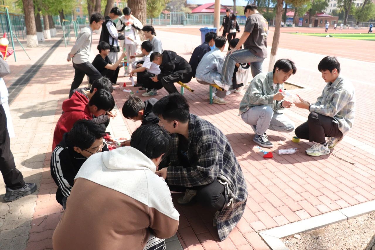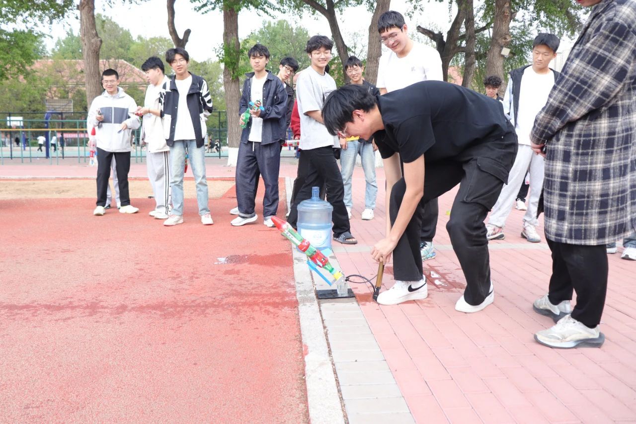 参加比赛的同学共有八组,各组选手现场制作水火箭,按照要求进行组装,同学们发挥自己的想象力,制作,调整,装饰自己的火箭。比赛现场气氛紧张而热烈,发射起点上各队的火箭手通过打气助力将造型各异的水火箭发射升空。现场同时进行两类测试,第一类是发射精准度测试,各组将水火箭发射到指定地点,根据落地与靶心的距离评分。第二类是高度测试,将水火箭垂直发射,计算发射到落地的时间差。