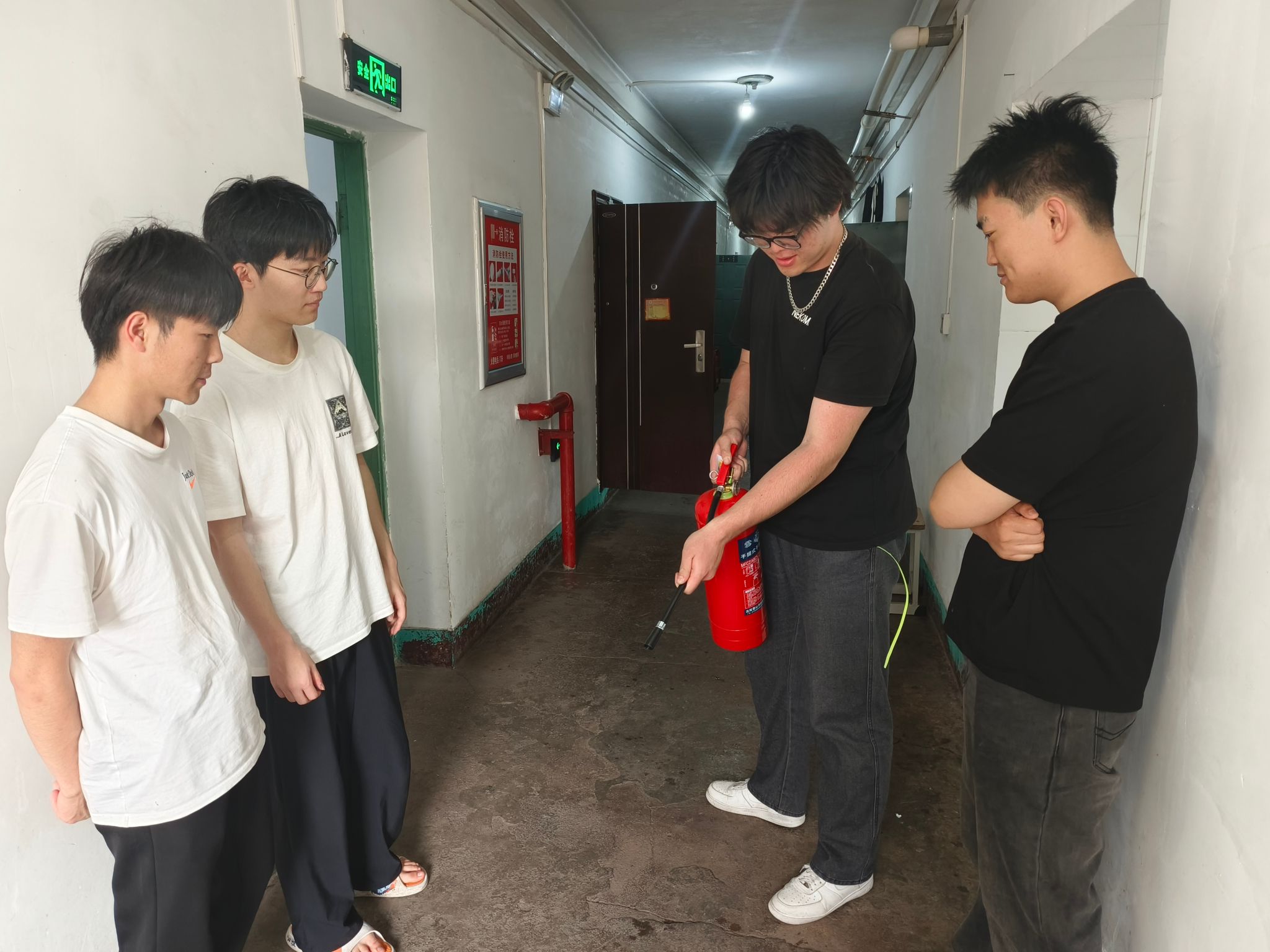 培训环节中,王瑞斌老师结合真实案例,深入解说宿舍物品摆放杂乱、私拉乱接电线、持有违规电器、室内吸烟等常见校园火灾隐患,重点讲解灭火器、消火栓的操作法及“弯腰低姿捂口鼻”的疏散要领。还介绍了各寝室的疏散通道以及火灾发生时的逃生技巧。让同学们对消防安全有了更深刻的认识。会后,王瑞斌老师组织同学们在二宿舍实地模拟了疏散和灭火场景,同学们分组操作灭火器模拟灭火,并进行疏散模拟。