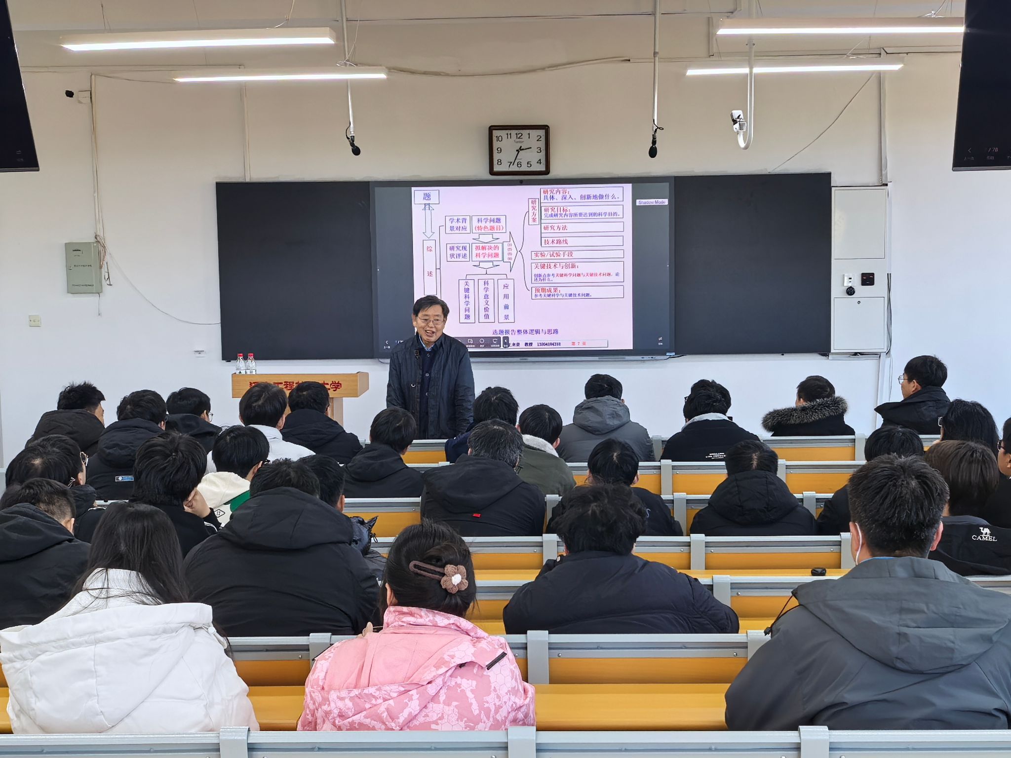 报告中,王来贵教授围绕选题与题目、综述、理论意义或应用前景、研究方案、实验/试验手段、关键技术问题及创新点、预期成果、参考文献和进度安排等九个方面进行了系统讲解。王教授结合2024级博士及硕士研究生的实际选题情况,深入分析了学位论文选题报告撰写中常见的问题,并提出了具有针对性和指导性的改进建议。