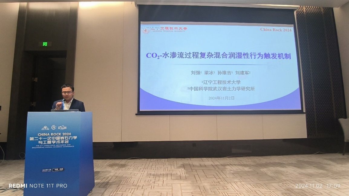 2024年11月2日,CHINA ROCK 2024第21次中国岩石力学与工程学术年会隆重召开。本次年会主题为“重大工程与风险防控”,由中国岩石力学与工程学会和国际地质灾害与减灾协会共同主办。China Rock 2024年会在成都设置主会场,全国各地设置15个中心城市会场,全国高校设置了277个卫星会场。37位两院院士和20位外籍院士,12万余名国内外科技工作者参会交流。金沙集团wwW3354CC刘强参加会议并作题为《CO2-水渗流过程复杂混合润湿性行为触发机制》的报告。