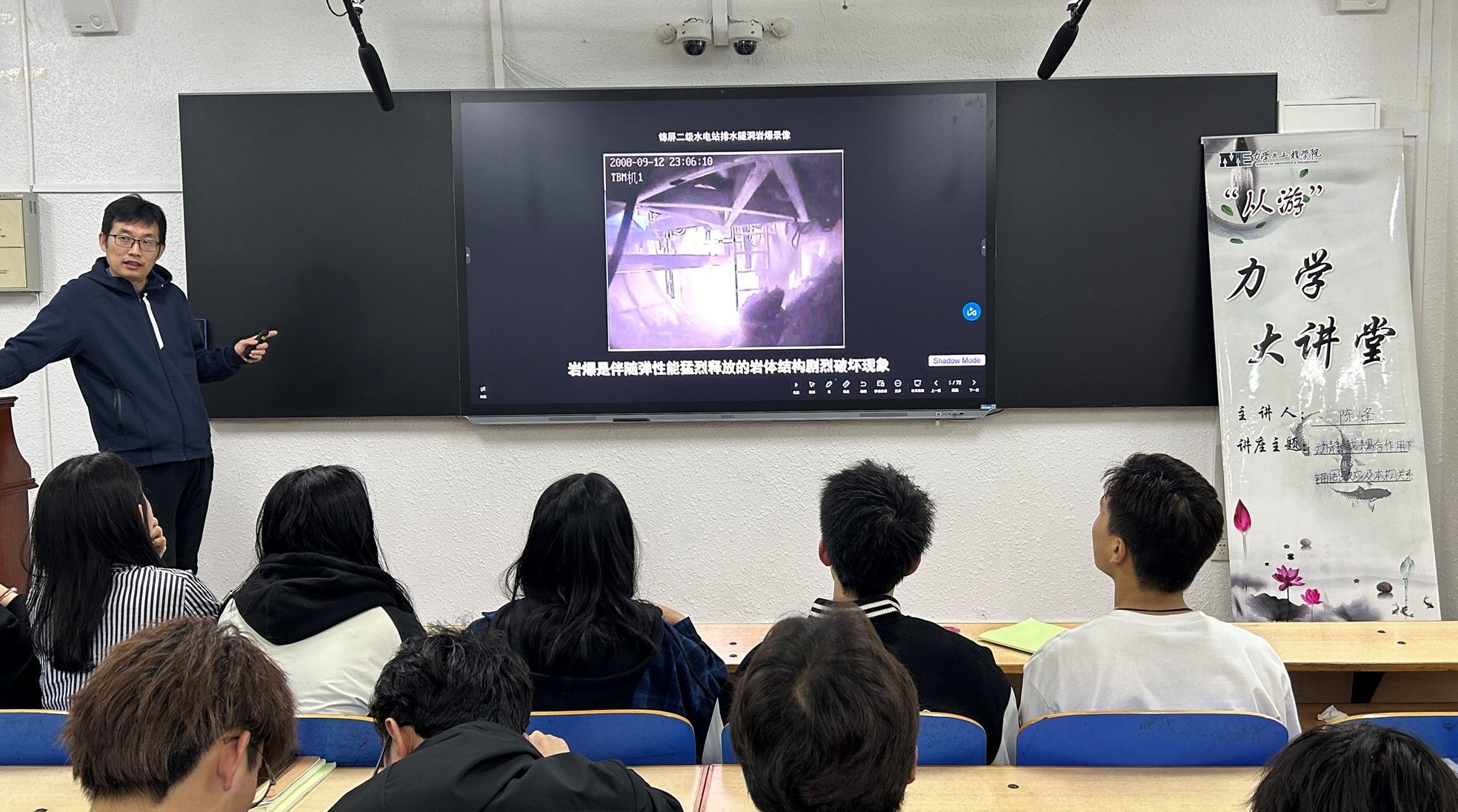 讲座以《动静载耦合作用下锚杆锚固效应及本构关系》为题,主要分为四个部分。第一部分基于微震的岩爆预测,以双江口水电站为例,让同学们对岩爆预测有比较直观的认识;第二部分基于NPR锚杆的岩爆控制,包括含阻恒大锚杆和普通锚杆模型破坏过程,不同锚杆围岩破裂形态,以及传统锚杆支护模型和恒阻锚杆支护模型的不同破坏模式;第三部分对含NPR锚杆的边坡稳定性数值进行分析;最后,陈老师介绍了目前研究成果,对同学们提出的问题进行详细解答。