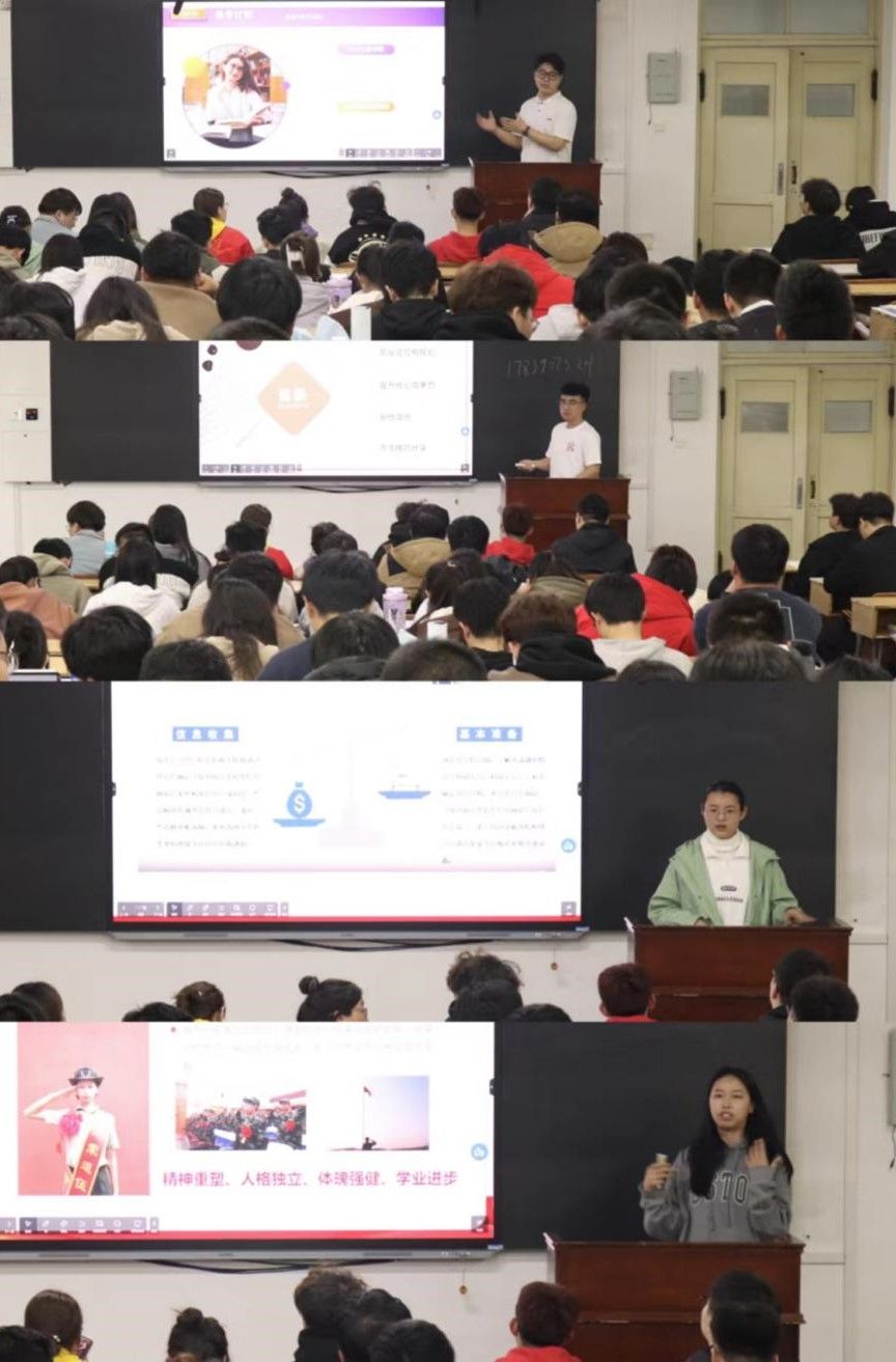 王丽宏副书记简单介绍了4名同学的先进事迹后分享会正式开始。首先由张豪同学根据自己的考研经历分享如何提前规划、准备和收集考研信息。他表示考研最重要的就是选取目标院校,要熟悉往届目标高校的录取分数,合理报考,打有准备之仗;程鼎坤同学介绍了力学专业的主要就业方向和就业单位,如土木工程师、结构工程师等。他表示职业目标的设定要根据自己的兴趣和专业方向,建议大家设定短期和长期相结合的职业目标,并详细分享了简历制作和面试技巧方面的各种细节;刘雅琪同学分享了保研的相关经验,介绍了前期的准备工作和保研具体方式,提醒同学们要多收集信息,了解最新政策。并讲解了面试前的准备工作,提前了解心仪导师的科研背景和方向,注意院校官网动态等有关信息;李岑蕊同学分享了自己参军入伍的经验,以《我的青春献给谁》为主题的参军短片进入正题,讲解了参军的条件和益处,并讲述了自身的参军故事。她表示参军是送给自己最好的成年礼,让一个普通的女孩学会了勇敢、担当与付出。四位同学的精彩分享为在场的大三同学带来了很大的震撼,博得了阵阵掌声。