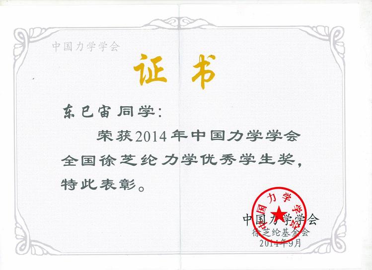 金沙集团wwW3354CC工程力学专业10级1班东巳宙同学荣获中国力学学会全国徐芝纶力学优秀学生奖。